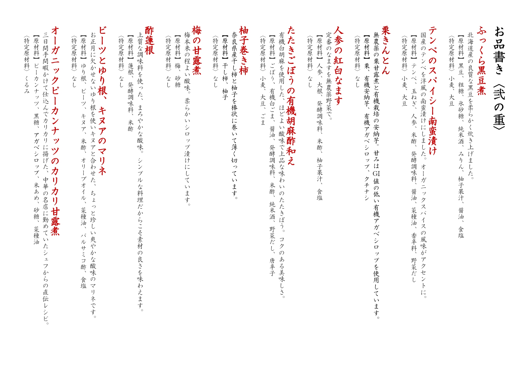 本商品は「二段重」でございますが、お品書きには「一段分」の献立のみが記載されておりました。